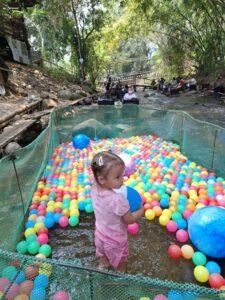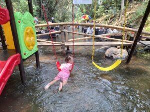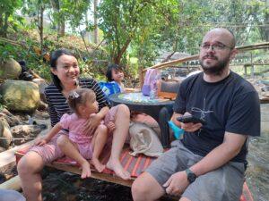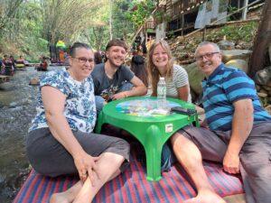 Peter en ik gingen op pad met twee vrijwilligers die 10 dagen bij ons waren. Naast het werken proberen we ook altijd tijd te maken voor ontspanning door middel van een uitstapje. Doordat de smog heel erg was besloten we geen lichamelijke inspanning te doen, maar een rit te maken door de omgeving. We waren zo’n 6-kilometer onderweg toen we ineens achter ons getoeter hoorden en tegelijkertijd telefoon kregen. Het bleek dat Chester, Pimpa en Saoirse achter ons reden samen met Pimpa haar zus en nichtje. Zij gingen lunchen met vrienden en ze vroegen of wij mee wilden. Aangezien wij nog niet wisten waar wij dat zouden gaan doen zijn we mee gegaan. Hun vrienden hadden deze plek uitgezocht, het was prachtig. Voor mensen die slecht ter been zijn is het af te raden, want je moet over een rotsig pad afdalen naar de rivier, over een smalle loopplank lopen en dan op een terrasje midden boven het water gaan zitten. Het paste net met zijn vieren op het terrasje. In de rivier hadden ze ook een speeltuin aangelegd waar Saoirse heerlijk heeft gespeeld. Het eten was lekker en je had daar weinig last van de smog en het was er een stuk koeler dan ergens anders. Super gezellig om daar met zijn allen te eten. Na de lunch gingen wij weer verder toeren met onze gasten, al met al een geslaagde dag.